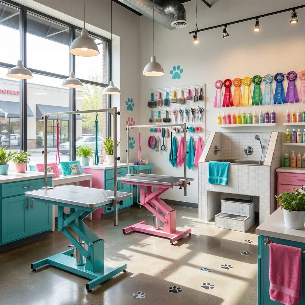 Área exclusiva de grooming con hidromasaje y secadores silenciosos.